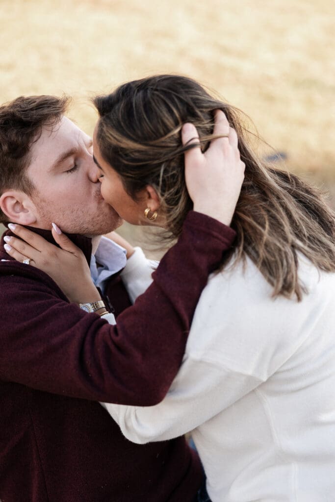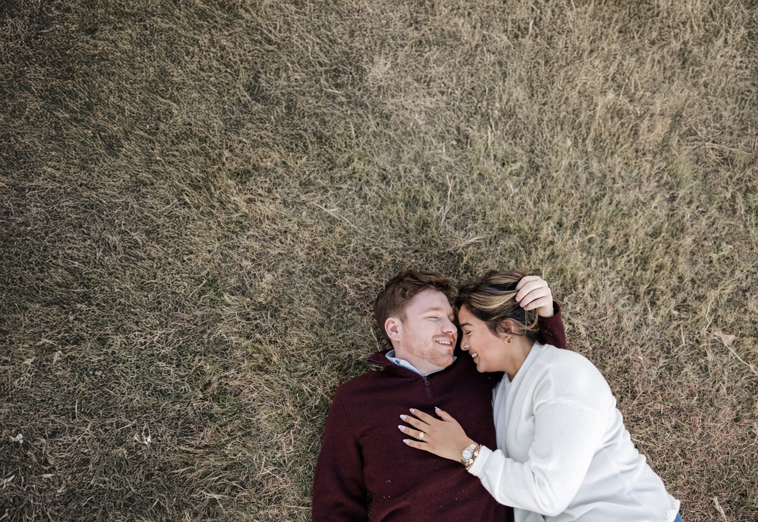 We met on a Sunday afternoon in mid-November around 3pm — the perfect time of year when the sun isn’t too high in the sky and the light is soft, giving the illusion of the beginnings of golden hour. Starting at the top of the hill just across from Bella Donna Chapel, we eased into the session with simple motions: walking hand in hand, leaning into each other, and simply existing together. Before long, their playful energy carried them across the grass, frolicking and laughing through every moment.