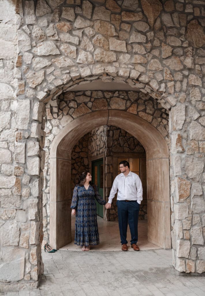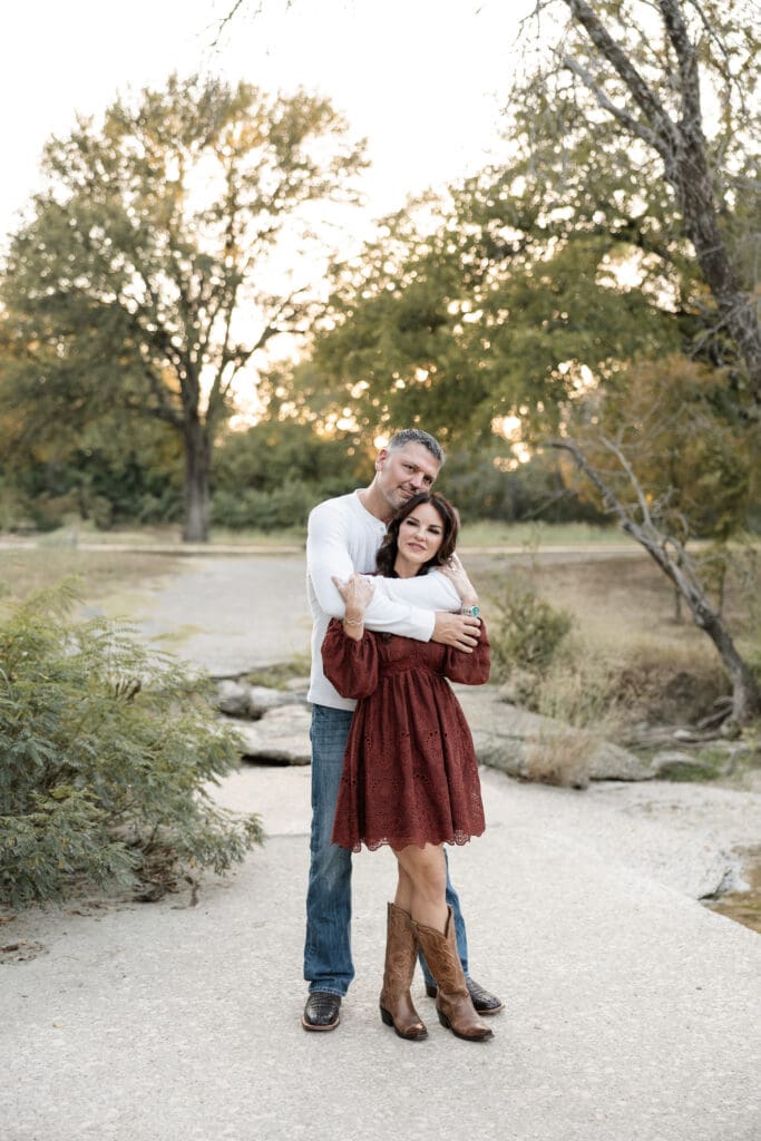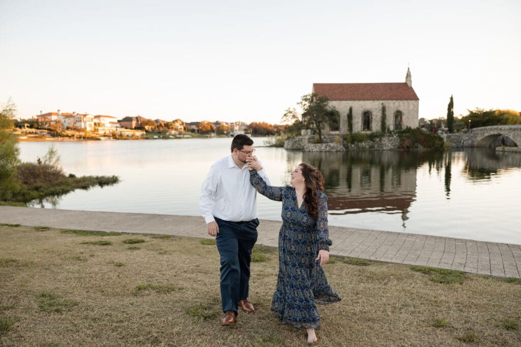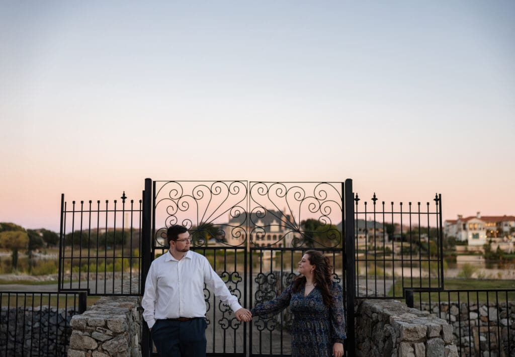 Engaged couple at Airfield Falls Park, Fort Worth, enjoying golden-hour engagement photos